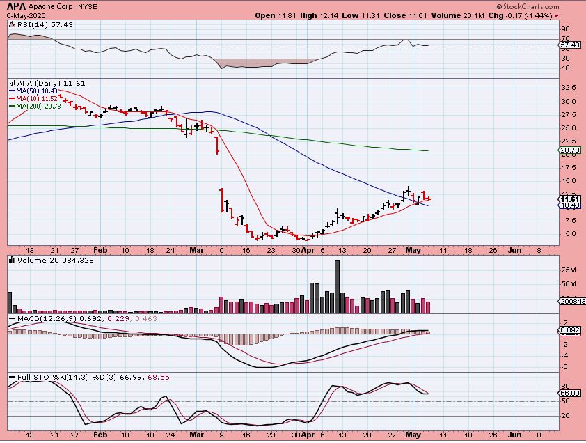 I still own APA, and many of these have been running up that 10sma. I’ll have to watch how it acts around that 50sma if it breaks the 10sma & gets down there. Many of these stocks look similar, bouncing off of the 10sma & 50sma, so they are still bullish, but choppy.