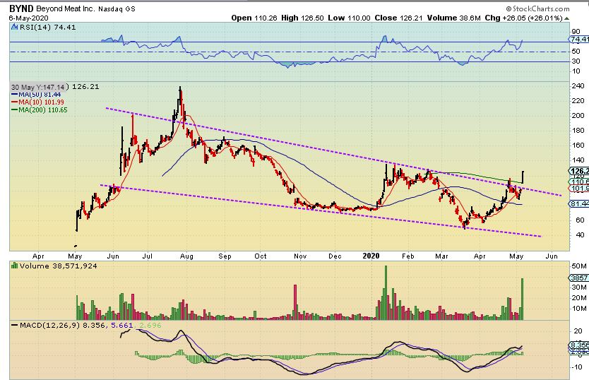 WHAT COULD REPLACE BEEF? Beyond Meat could. It is kind of hard to buy it after this gap open. Put this on a watch list, and buy it if it dips with the general markets, because this could run back to that $240 area. I honestly think this break Wednesday with that volume?? This could easily get some panic buying and could just run straight line to the highs. Congrats if you own it already.