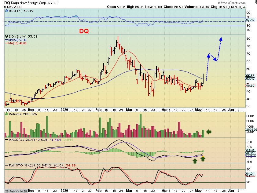 DQ has been known to run strongly. I have traded it in the past, and I know Maria likes this one. It broke out with volume and could be ready to go again. This is a buy above the 50 sma.