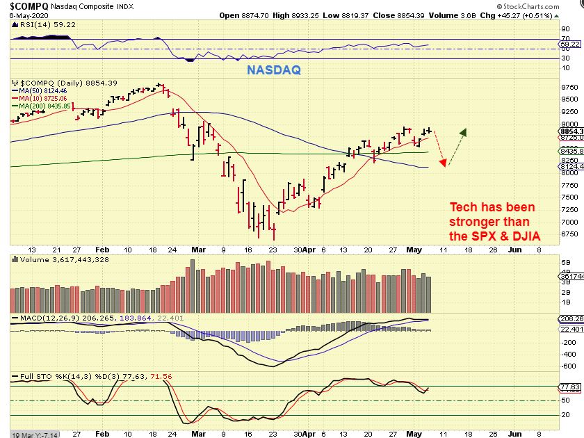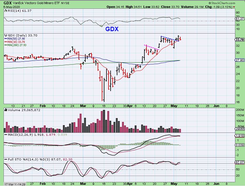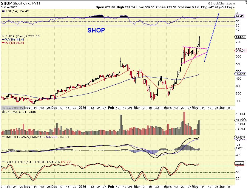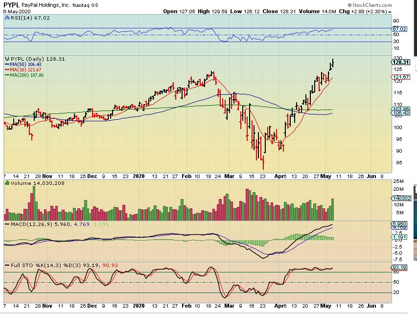 PYPL is also breaking to new highs. That makes sense that PayPal would benefit from increased online shopping. These are the ones that you may want to ‘Buy a pull back’, if we get one with a dip to a dcl in the General Markets.