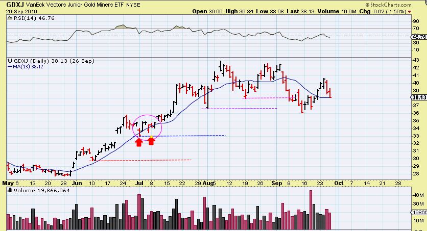 I went back to take a close up of that May ICL 2019 run. GDXJ did break the 10 & even the 13 sma on the run higher a few times, but it was a series of higher lows until that intermediate cycle topped 3 months later.