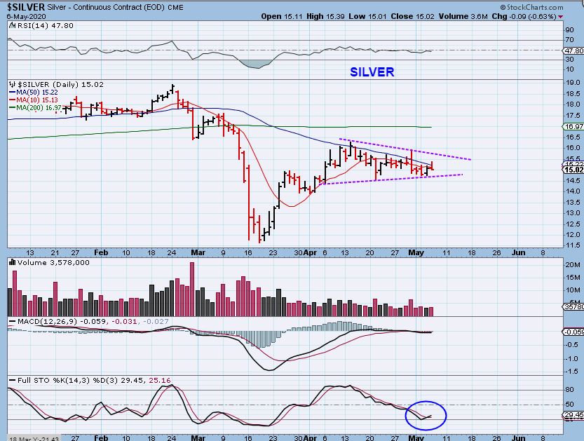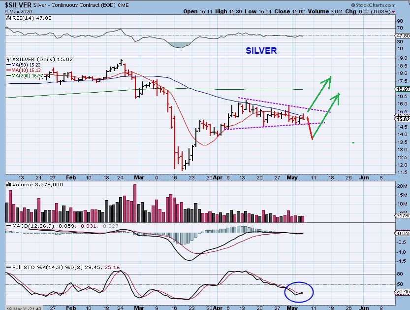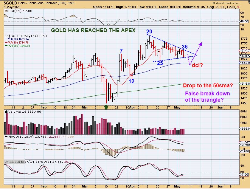 The good news should be that GOLD is getting late! This is day 36 ahead of that ICL and we are also running out of room in this Triangle. This can break out higher and run at anytime, or it may do a quick shake out as shown, but I still expect higher price. All we can do is watch it now, time is pretty much up.