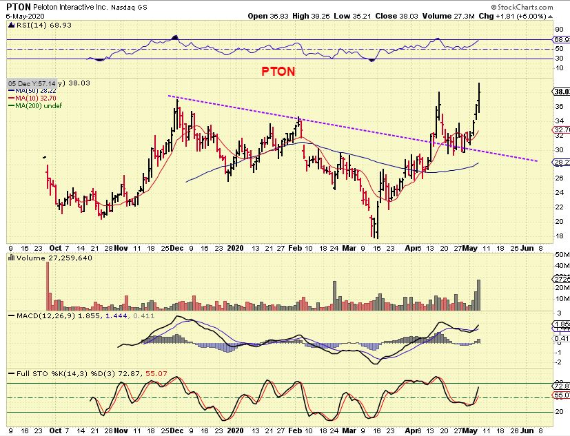 PTON – Gyms are closed, I guess people are working out at home more. PTON is breaking to new highs. They released earnings & were up another $4 after hrs. My point is …