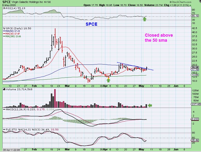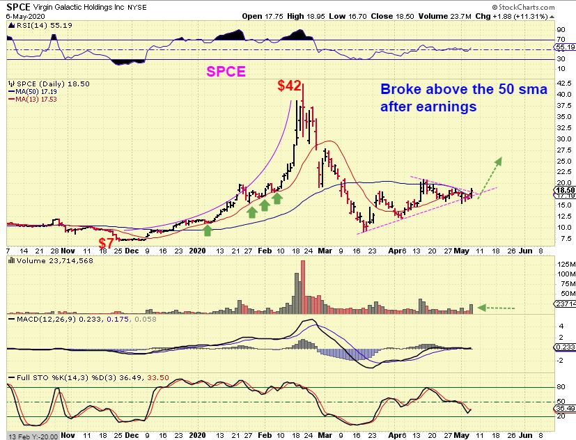 SPCE also released earnings and then broke over the 50 sma with Volume. They announced a deal with NASA too, so I think that this can now run, and boy did THIS run earlier in 2020. This could be COVID-Proof to a degree.