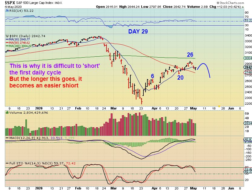 SPX – I also drew this, a bounce & drop to the 50sma, saying that a first daily cycle isn’t always worth ‘shorting’, since they can remain strong. Well..
