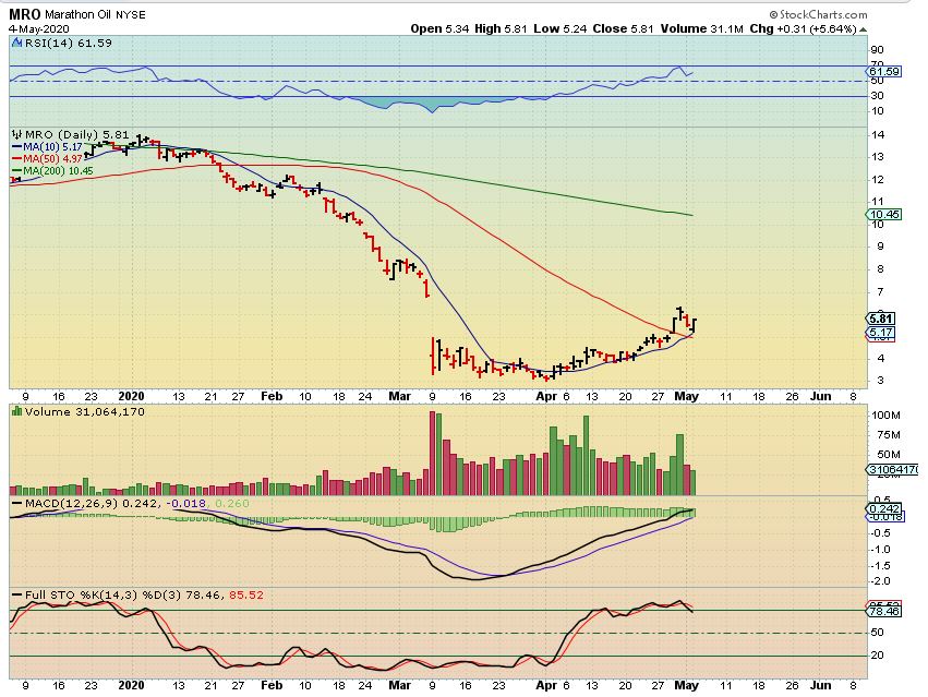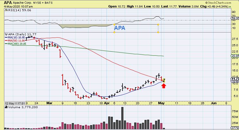 APA broke above the 50sma, back tested it & the 10sma Friday and Monday morning, and pushed higher. THIS IS A BULLISH REVERSAL, and stops can be raised to under that 50sma. This has tripled off of the lows, but it also can be bought with a stop, since this may run to the 200sma at $20 ( 100 % gains again). I own it, I added.