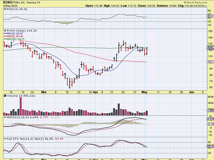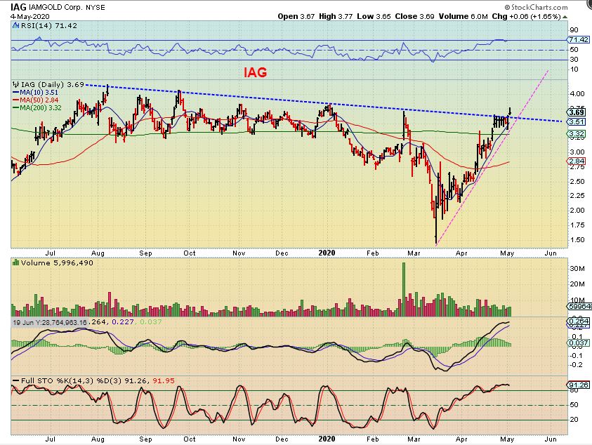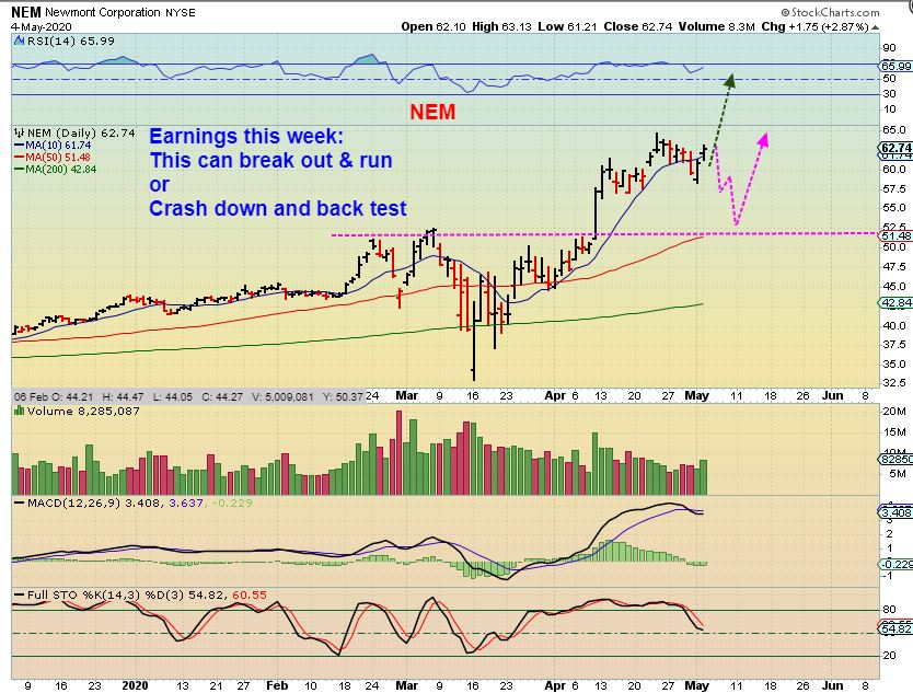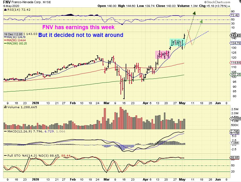 FNV also has an earning release May 6th, but it broke out ahead of time. If I owned FNV I’d view that as great, because it either signals that buyers want in now and it is breaking out pre-earnings or even if it drops with earnings- the drop may now only be only back to last weeks price. We’ll just have to wait and see how earnings go, but…