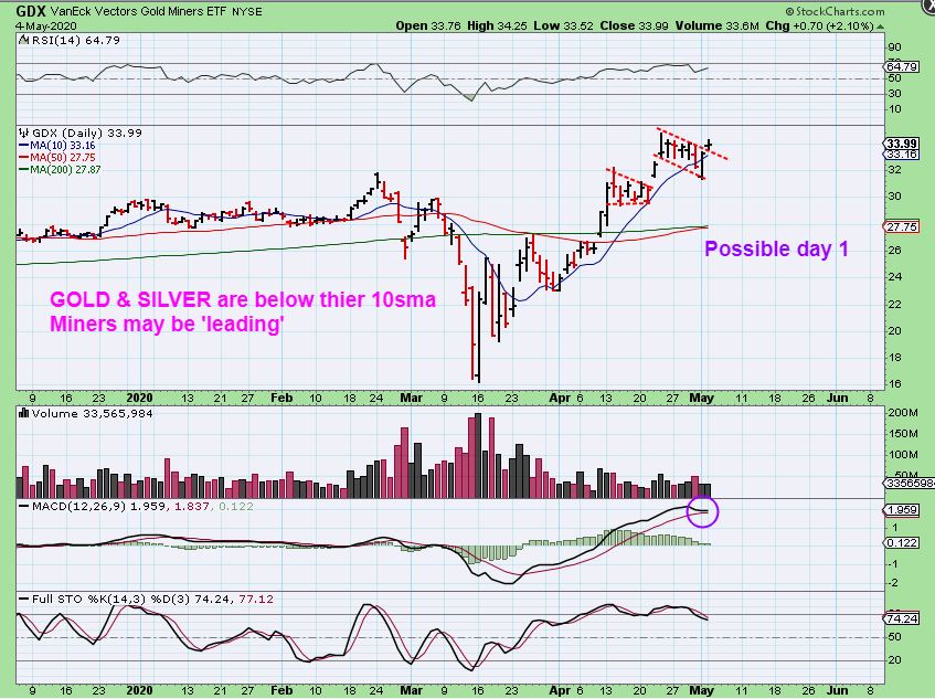 GDX – Now we see that Miners are ahead of Silver & Gold. That is Bullish and that is what we want to see. This could be day 1 for GDX since it broke the 10sma & recovered in a similar manner that we saw in the summer of 2019 (as explained in the weekend report). Monday I saw more than just GDX & GDXJ trying to break their flags…