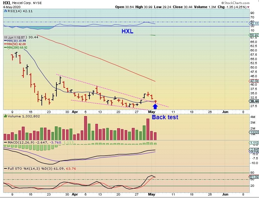 HXL dropped and tagged the trend line from the descending wedge. It closed at the 10sma again.