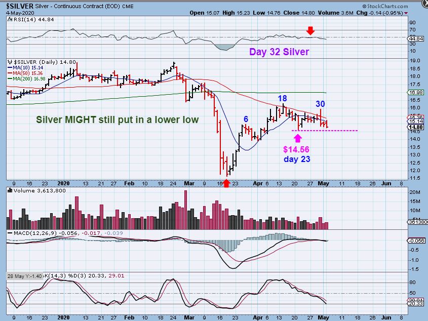 SILVER is on day 32 and it can drop below the day 23 low to complete the daily cycle. A break above the red 50sma line should signal a Buy.