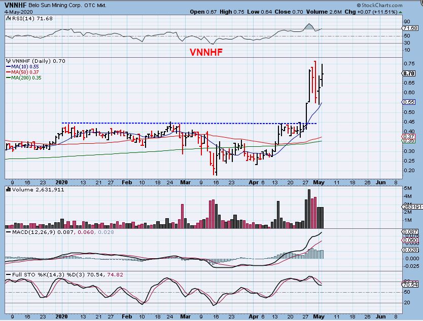 VNNHF has been pointed out here as Bullish and after a quick drop to the 10sma & reversal Friday, it was up 11.5% again on Monday. Honestly? I expected a back test of that break out, but Buyers are stepping in.