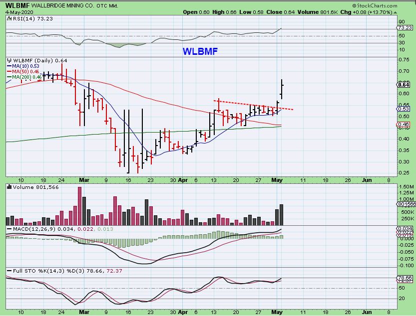 On Friday I saw the volume pop on WLBMF and was thinking of buying it. It Popped about 14% Monday – I don’t own it 🙁 but … do you see that somewhat flat topped consolidation break out?…
