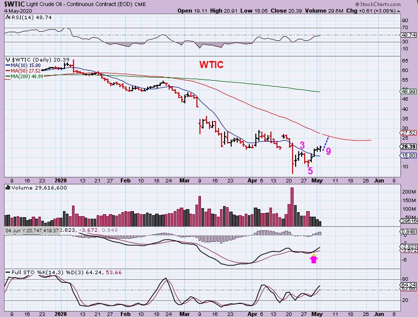 WTIC is on day 9 and continued higher. I’m watching to see what happens at the 50sma. Oil could strengthen now that that panic FLUSH is out of the way, but