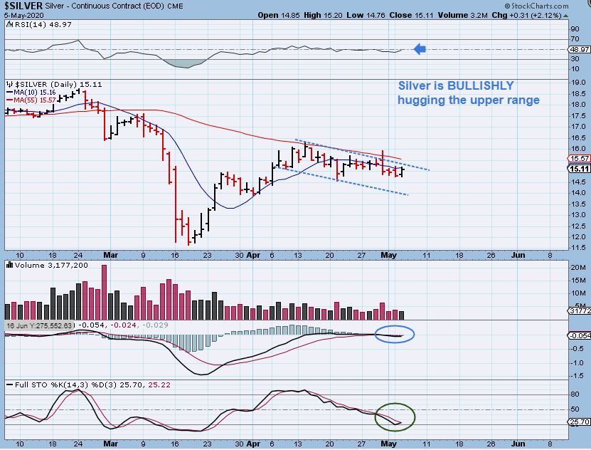 SILVER needs to play catch up and when it breaks above the 50sma it could really run swiftly. So far this long consolidation can be a way to build up energy to break that 50 sma & the 200 sma that is above that too (not shown).