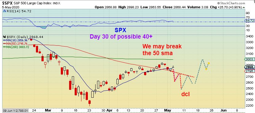SPX #2 – We are due for a dip into a dcl here at day 30, so you may see a break of the 50sma and a drop like this, or…