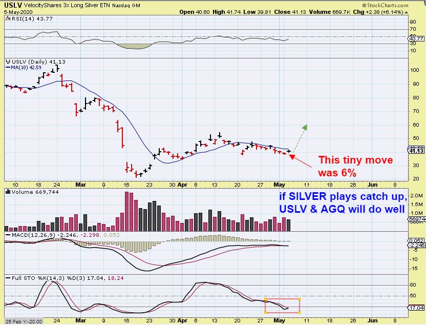 USLV & AGQ – I have mentioned that I bought USLV and I was asked why, since I rarely mentioned buying it at prior ICL’s. I usually choose JNUG as leverage, and I do own some now, but my reasoning for a USLV purchase is that I think the upside potential for Silver is great if it gets above the 50sma. I do think that Silver should play ‘Catch up’, since Gold & Miners are already up at recent highs.