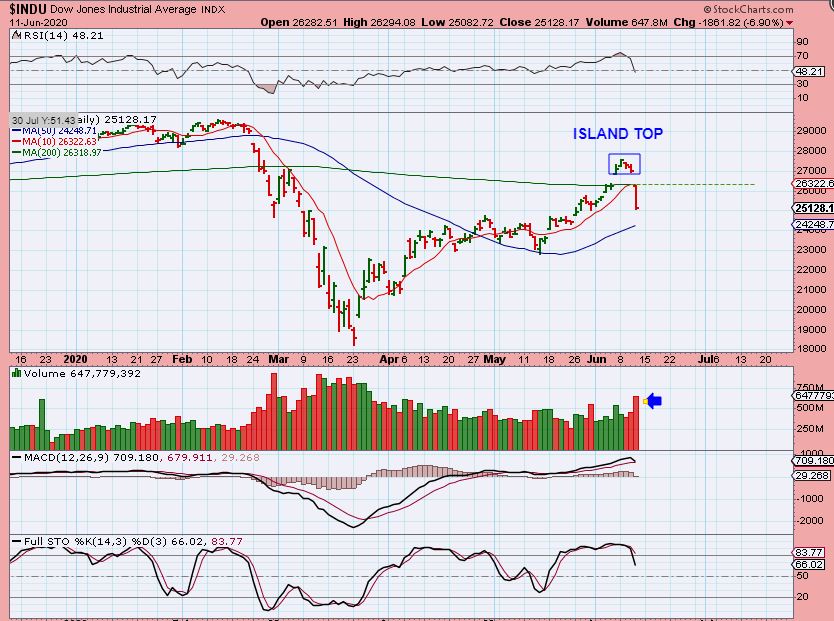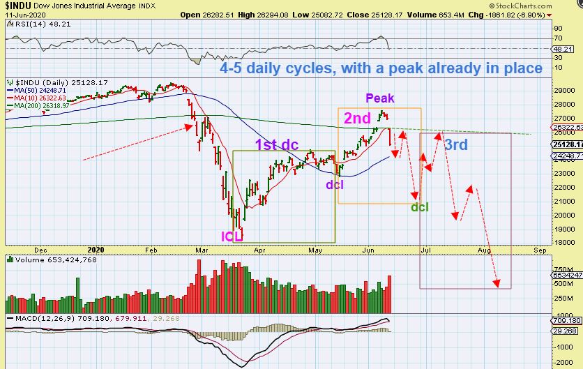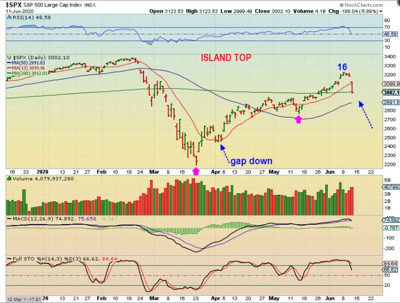THE DJIA was down….almost 2000 points! That gap down caused an Island Top. These are often very bearish. What does that mean? It means that even though this could bounce or chop around, this might be THE PEAK of the intermediate cycle taking place during the 2nd daily cycle. This could get ugly longer term,