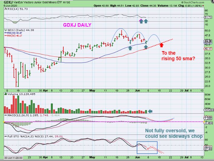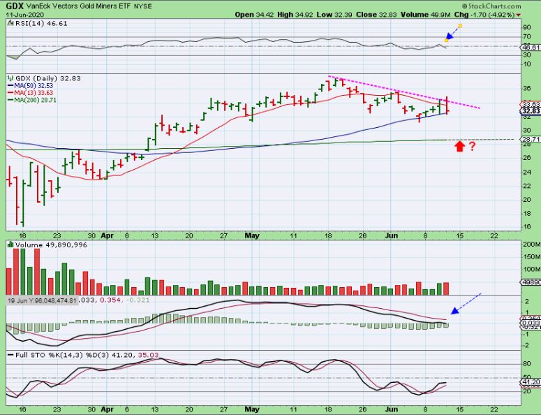 GDX also pushed to new highs with the Dow down 700 points, and everything looked to be playing out as expected. Suddenly, many Miners rolled over and started to sell off. This looked like a DCL 4 days ago, but now this could break down to the 200sma. IT IS POSSIBLE that Miners are being liquidated to pay off Margin Calls, offset losses in the General Markets, or Big Boys are selling to scare out retail investors and buy up their shares. etc.