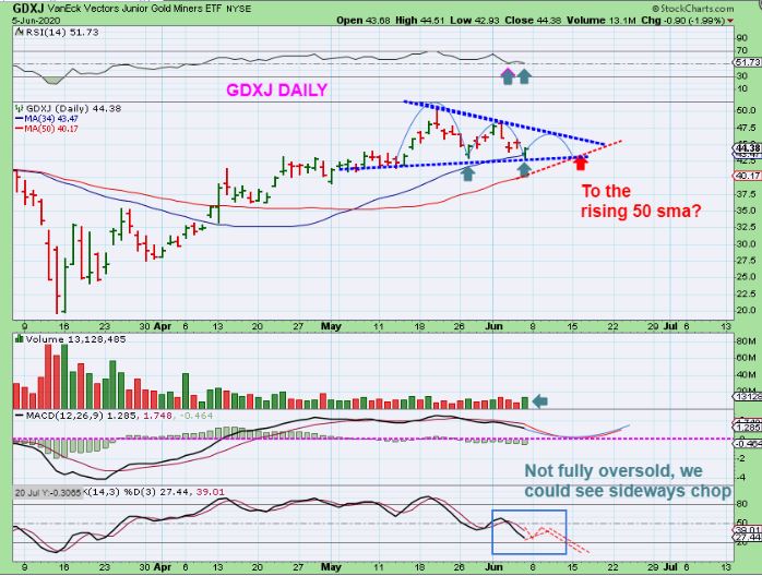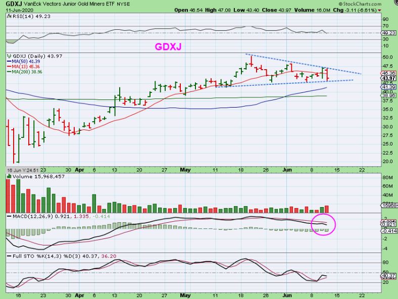 GDXJ had a nice triangle, but it is now back at the lower trend line. A drop tomorrow probably sends this to the 50 or 200 sma.