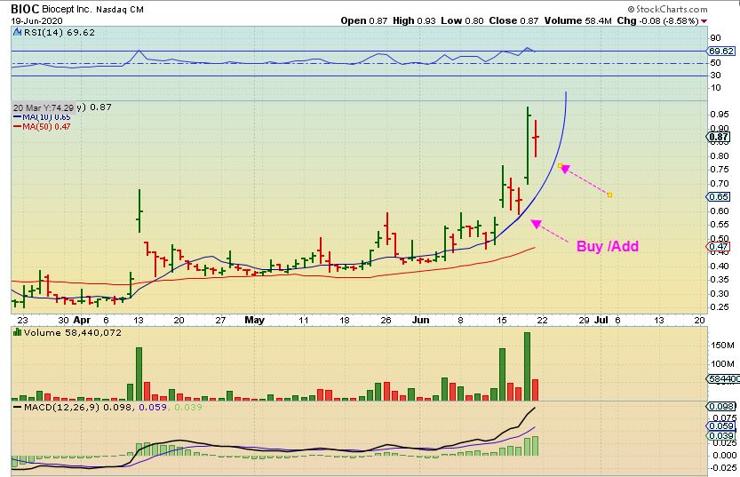 BIOC BUY BACK – I posted this chart and discussed buying a dip to the 10sma on the pull back before it exploded higher. Well…