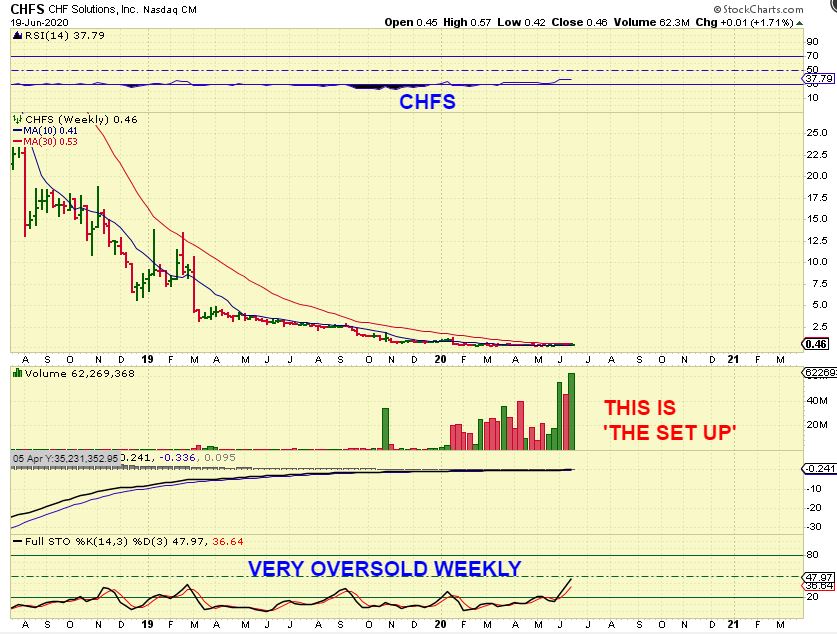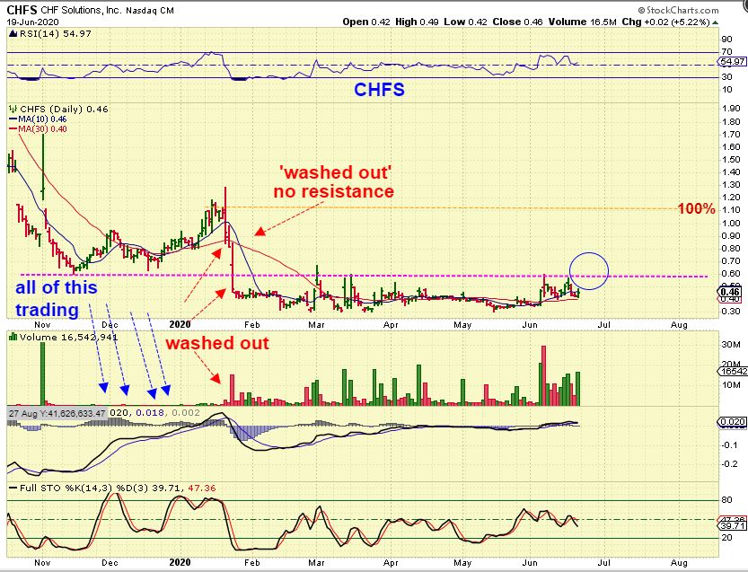 Yep, CHFS did the dreaded public offering in January to raise money, after running up from 60 cents to $1.20. My review of this chart is as follows ( and is written on the chart).