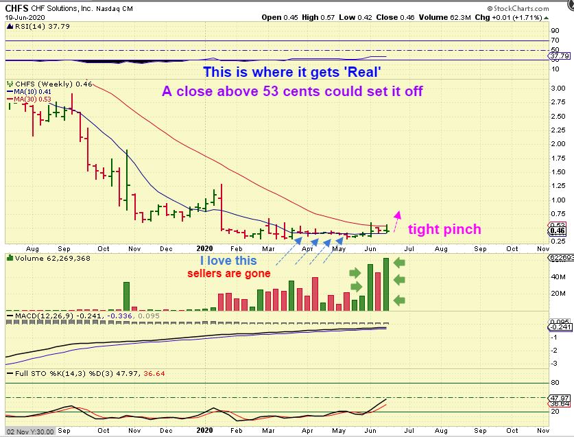 CHFS Weekly price is pinched or squeezed between the 10weekly ma & 30 weekly ma. In technical analysis alone, this can be explosive, but add to that the chance that good news comes out? This is very bullish looking.