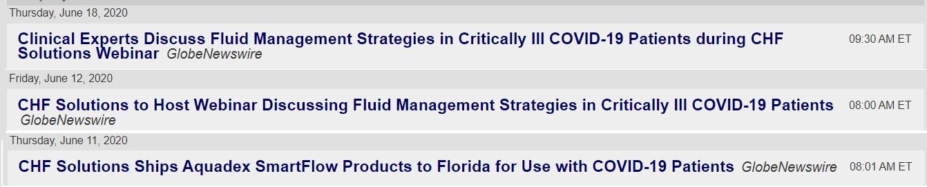 The June 11 Florida article stated, ” CHF Solutions today announced that it has sold Aquadex SmartFlow(TM) consoles and disposables to a critical care hospital for use in the treatment of COVID-19 patients in Central Florida.” This may lead to increased sales if they find it is helpful. Early reports are that it is helping. Now to a chart…