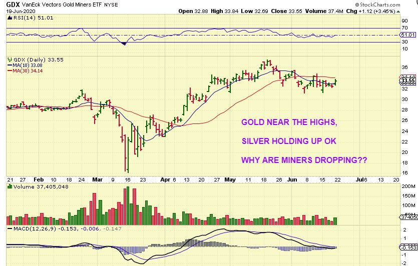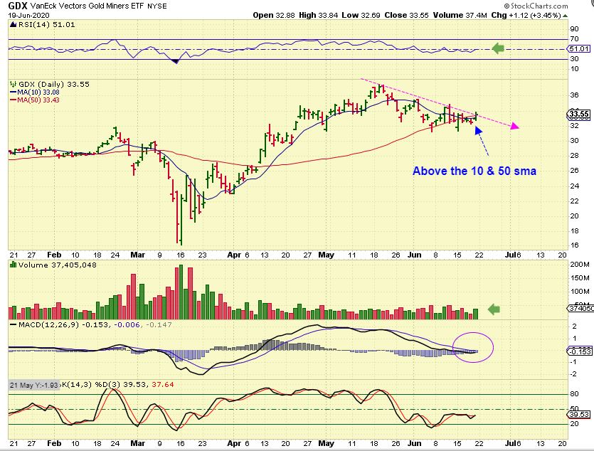 GDX DAILY – I just want to also say that this daily chart is bullish. Volume increased and price has regained both the 10 & 50sma Friday. One more day higher and that MACD will also probably cross upward and the trend line will be broken. Last week was a low risk buy in my opinion.