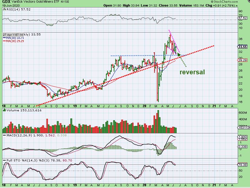 GDX WEEKLY – I see a nice reversal ready to break out of a possible descending wedge on the weekly chart too. It COULD drop 1 more week to that red uptrend line, but I don’t think that it will.