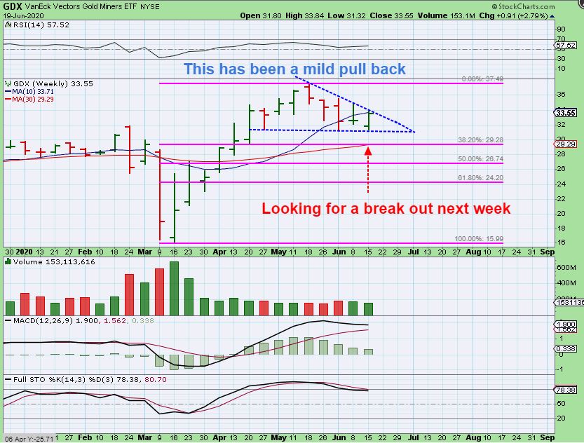 GDX WEEKLY – Well, The miners have been pulling back to do that back test of the break out. That is normal and we do have a solid reversal this week off of support. This looks bullish…