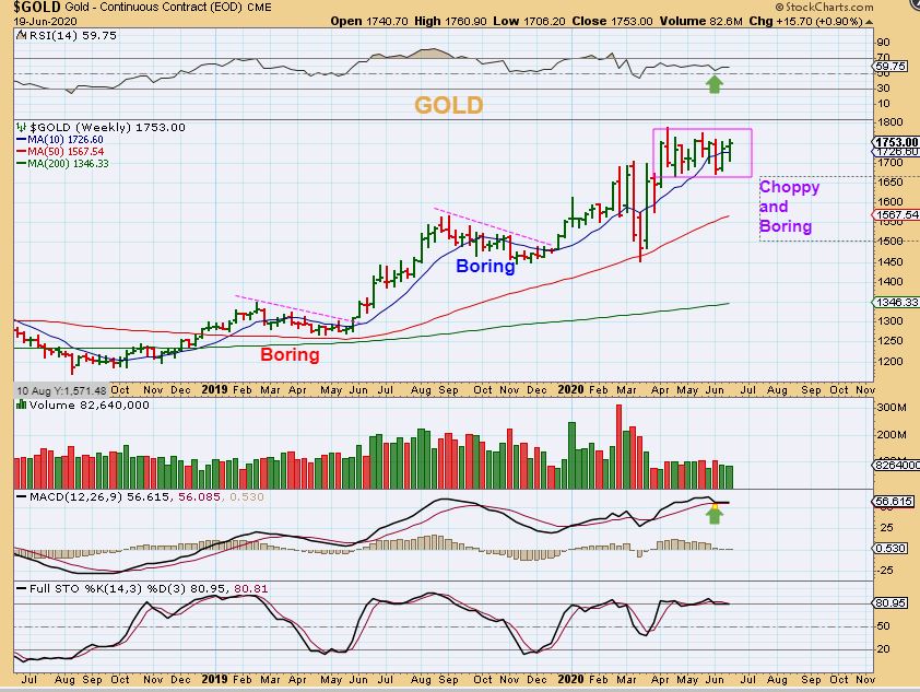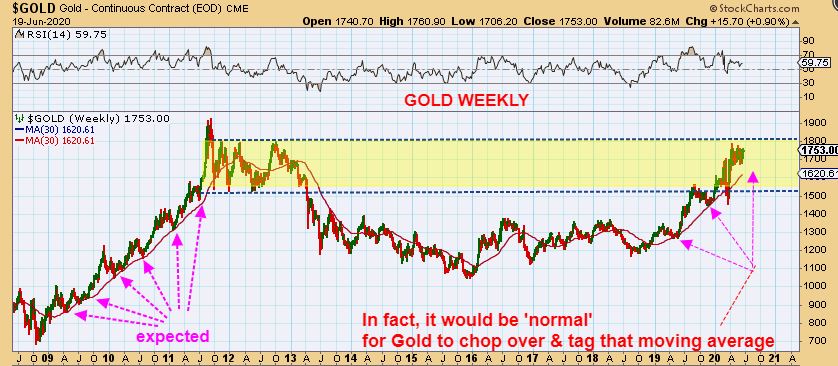 GOLD WEEKLY– Read the chart and see why the sideways consolidation continuing would be absolutely normal. See also the bull Run from 2008-2011 for proof. I HATE to say it, but Gold really could remain choppy as it breaks higher.