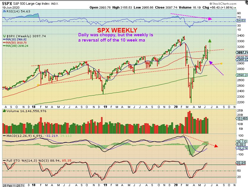 SPX WEEKLY– So that would push us above my first target of 3200, discussed as we came out of the ICL (March lows). Along the way I said we would hit that area and “Then I want to take a look and see how things look from there. Are they Bullish or Bearish?”. Well, I thought that we might see weakness by now, but this remains bullish. The crash on Thursday over a week ago is a dim memory now. Just another dip where many people began ‘Shorting for a big crash’.