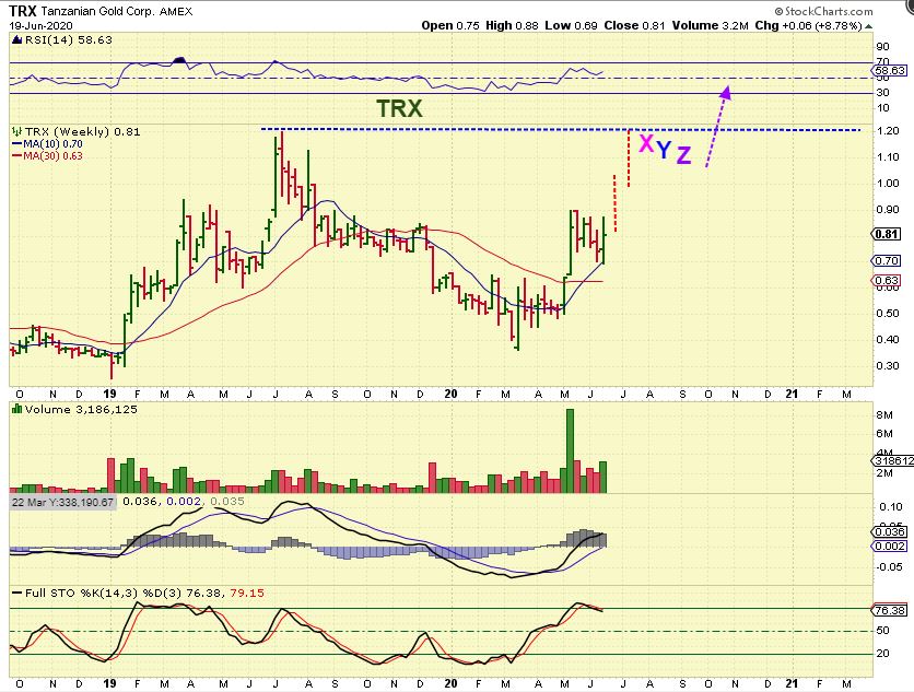TRX WEEKLY – I just wanted to point out TRX again. They released good news last week and price has reversed off of the 10 week ma. This really looks ready to tack on at least another 50%. Wait, what? Really? Yes, a run from 80 cents to the recent highs at $1.20 is very likely and that is a 50% gain.