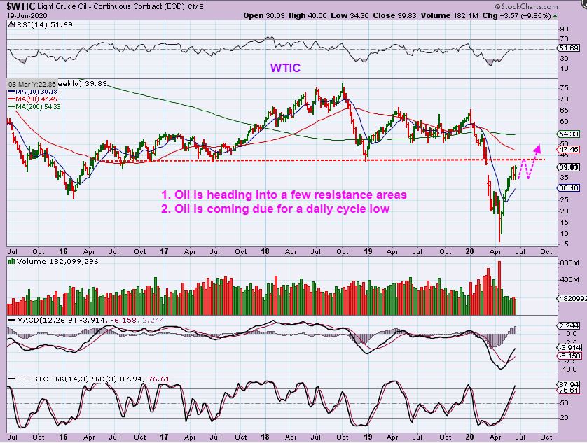 WTIC WEEKLY – Oil has made it back to $40. I expect a push higher to resistance near $44 -$45 as drawn. Please read the chart.
