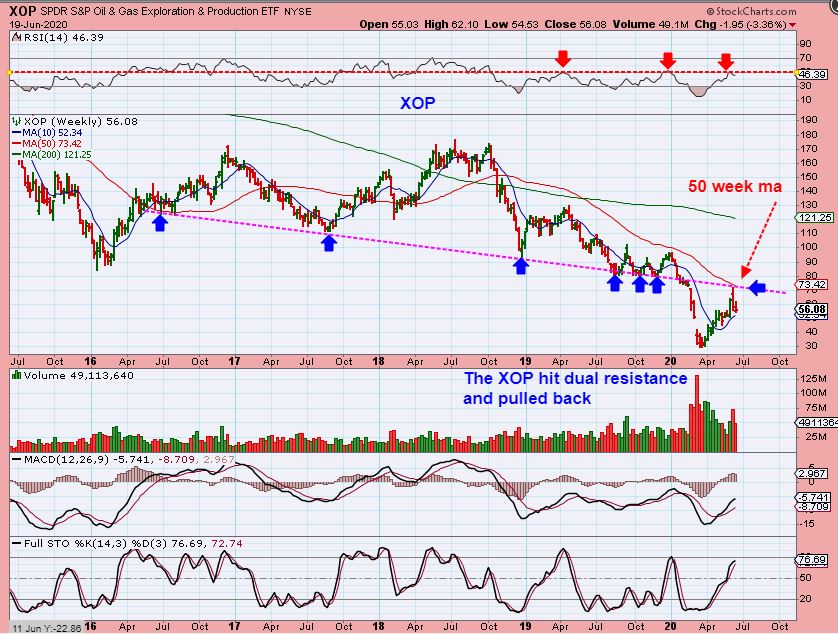 XOP WEEKLY – We bought the lows in Energy stocks and this has been a rewarding ride, but very choppy. I have traded in and out of this sector, but it could have been buy & hold if you could take the deep dips. We now hit resistance ( 50 week MA & trend line – see chart) , pulled back and near the 10 week ma. This could eventually pop above resistance and Oil stocks would continue their ‘recovery run’.