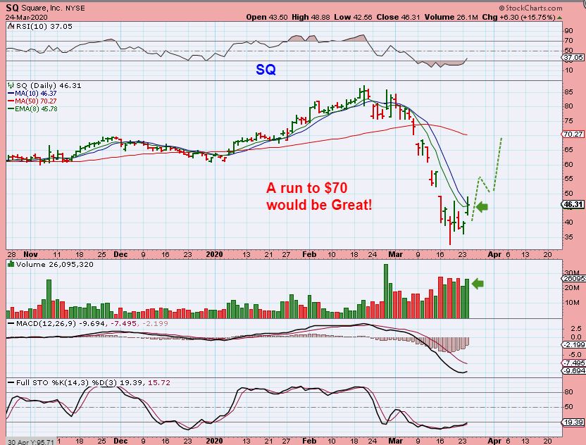 SQ BY REQUEST – I liked SQ in the Bull run during 2019 and recommended it in March a few times after the crash.  I Recommended it on March 24th here.  BELIEVE IT OR NOT, SOMEONE BOUGHT IT & HELD!  Congrats to you  D.J.!  The question was: