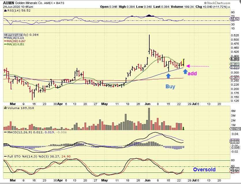 AUMN  was a breath of fresh air, and a few other Miners also ignored the selling. I actually added to AUMN as it broke higher, since this is a bullish set up and had an easy place to put a stop on the new position ( 34 sma).