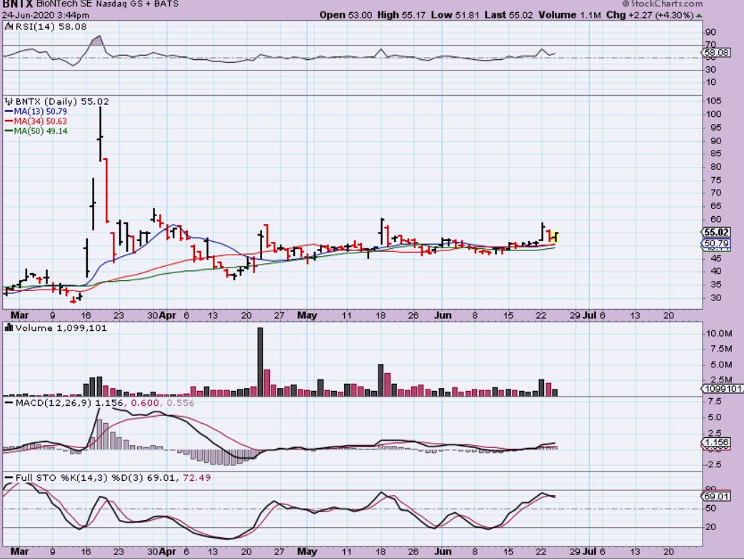 BNTX  has been consolidating bullishly and popping here and there along the way.  This may be ready to go right now. I may buy this Thursday if it starts to rise.