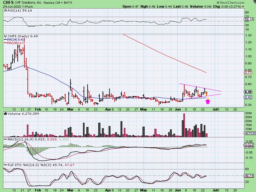 CHFS also dropped and bounced into the close.  I grabbed this chart to again show a possible large triangle forming.  It actually closed slightly Green, I am also still holding CHFS.