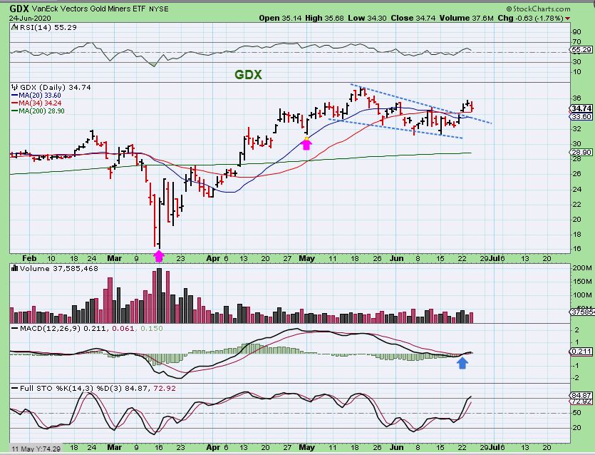 GDX dropped and also bounced off of the 34 sma. This is not that bad, considering that the Dow was down 700 points and the Nasdaq was down 222 points. It would have been MUCH BETTER if Miners ran higher as the markets dipped down, but so far- this is not so bad. Some Miners were green too.