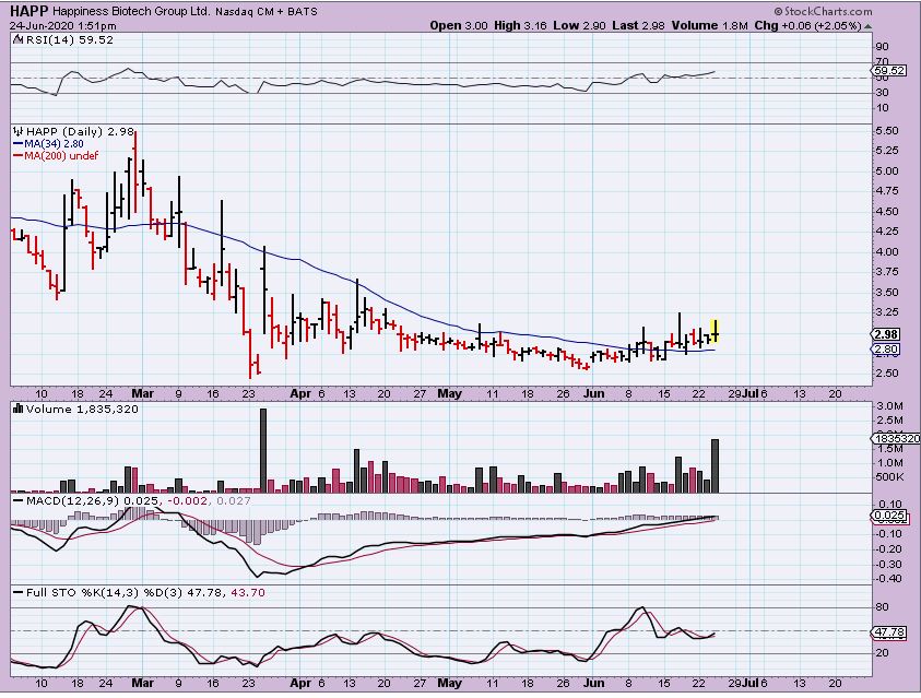 HAPPY CHART – The volume is increasing and it made me wonder if management is buying or knows something? I took a position here Under $3 and at $3 ( So my Dollar avg is $3) and a stop is under the 34 sma. Price is over the 10, 20, 34, and 50 sma.  I am just trying to get in low, in case it makes a run.