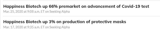HAPPY NEWS  🙂 – This company is called Happiness Biotech, and they produce protective masks and were working on a covid test in march.  It has been basing since then….