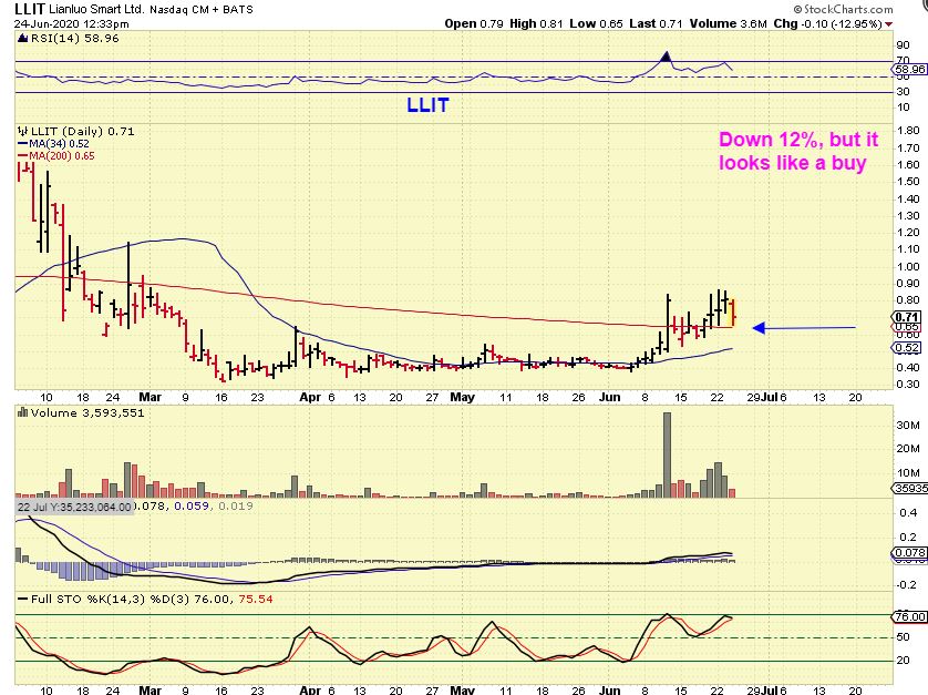 LLIT – Midday I pointed out that even with a 12% drop, it just keeps bouncing off of the 200sma and remains fine. Later that day it bounced back up to 77 cents and put in another reversal candle.   I am still in my position.