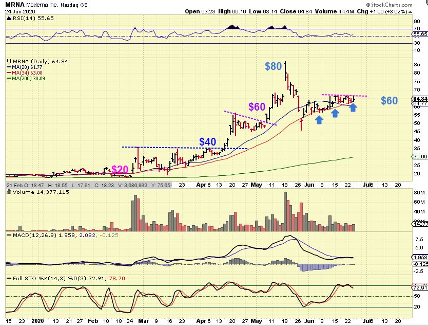 MRNA is also on support and could easily run from $60 to $80 or $100, the way these move lately.