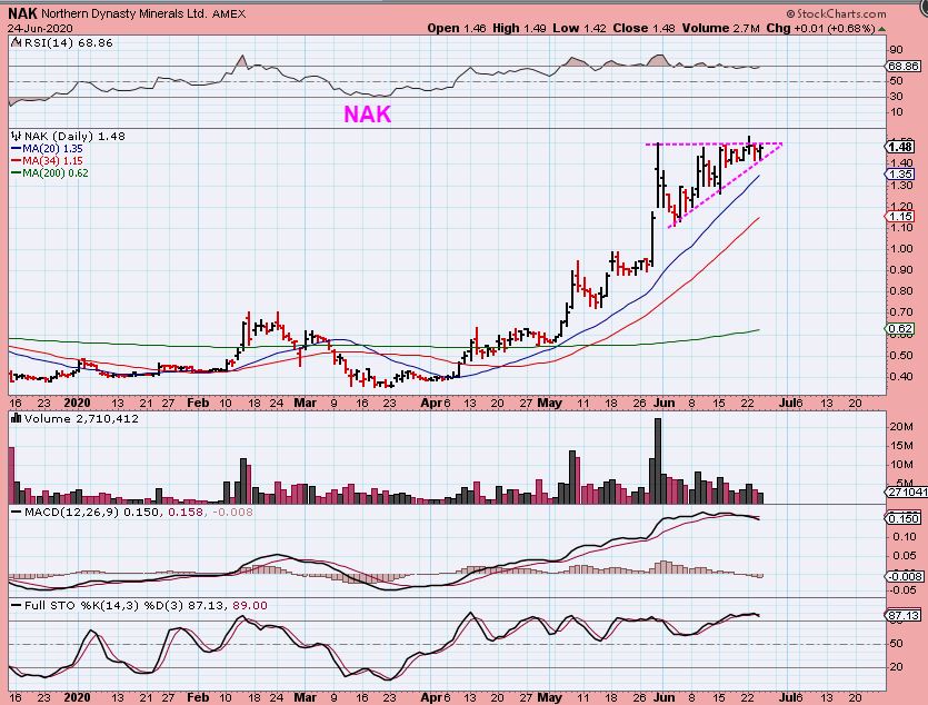 NAK has a bullish pattern and a break out higher should run nicely ( this could be bought on the break out or here with a tight stop).
