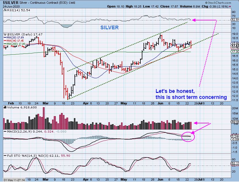 SILVER dropped right to the 34 sma again and bounced a bit, so hopefully Wednesdays lows hold up, because  more of that drop would break the channel.