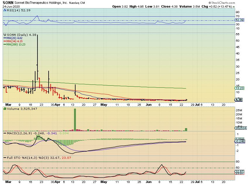 SONN #2 – SONN had some large volume coming in and it popped from the base.  False POP or Pop & run? I read that they have 40 million cash and a promising treatment for Covid / inflammation. It also has 38% short interest, so if good news is released and shorts cover, this could run.