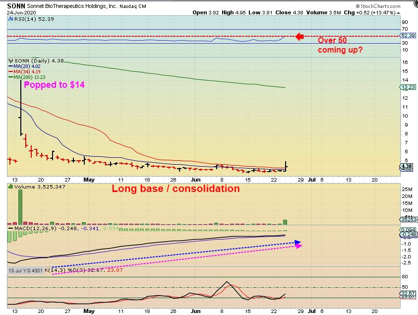 SONN #1 – SONN had a reverse split in April to keep price over $1. It has now formed a LONG BASE.