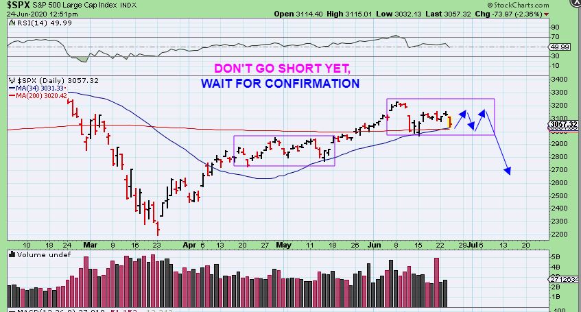 NVAX JUNE 16 – Recently I pointed out several ‘Corona-themed’ companies, due to a possible increase in cases again as places relax restrictions, testing increases,  and closed down places of business ‘open up”. NVAX was bullish here at $50, I did not buy it, but…