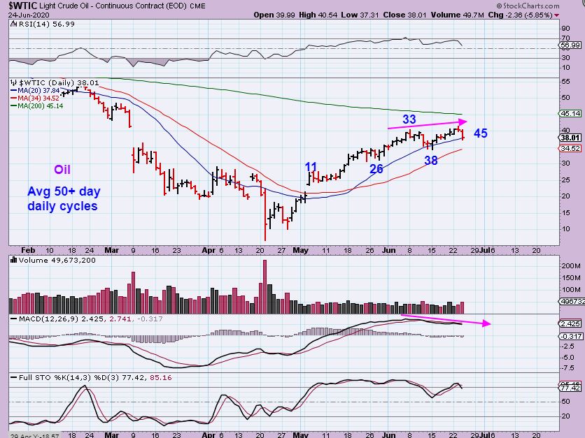 I pointed out the divergence in Oil yesterday and Wednesday  ( oil inventory day) saw Oil drop 5%. On day 45,  this very well could be the drop into a dcl starting.  I personally would close long oil positions  ( I am already out of any that I took a while ago, like OAS, CPE, APA, OKE, MRO, etc). After a dcl is in place, Oil should become a Buy again.